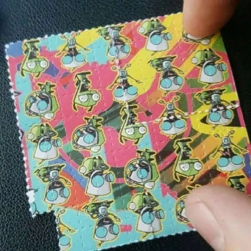 A tab of acid is a small piece of blotter paper soaked in liquid LSD. It makes dosing LSD much safer, more accurate and easier to distribute. Blotters are cut from large printed sheets with artwork. Each sheet is 7.5×7.5″ and contains 100 perforated squares called tabs. One square contains 250 mcg of LSD.